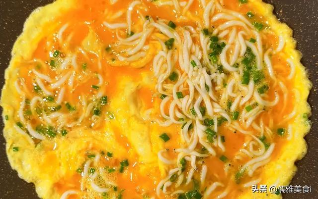 3. 把蛋液均匀淋在小银鱼上,先静置片刻,待蛋液底部凝固后,再用铲子轻轻翻炒成鸡蛋鱼块。