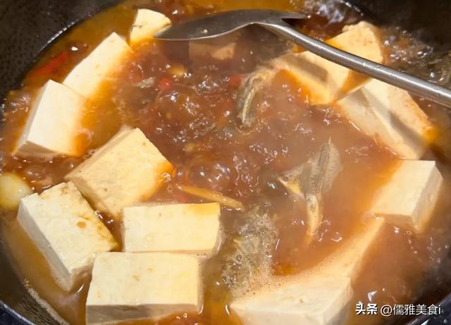 3. 倒入足量开水,大火煮沸5分钟,汤汁立马变得浓稠乳白,再放入豆腐块,转小火慢炖10分钟,让豆腐充分吸收鱼鲜。