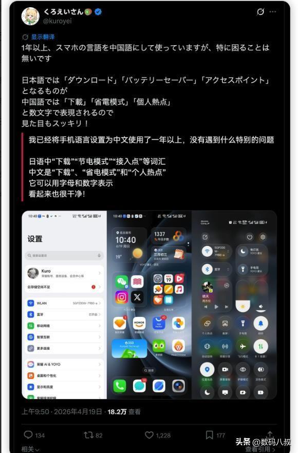 这股 “中文界面热潮” 最初兴起于 2026 年 4 月,起初只是个别日本数码爱好者的小众尝试,随着分享人数不断增多,相关话题迅速发酵,成为日本网络上的热门讨论。参与分享的日本网友覆盖不同年龄层,既有年轻学生、上班族,也有中老年用户,他们不约而同地表示,切换到中文系统后,原本繁杂的手机界面变得焕然一新,使用体验大幅提升。有日本网友甚至专门发帖对比:“日文界面像一堆没完成的笔画,杂乱无章;中文界面方正整齐,看着就舒服”。